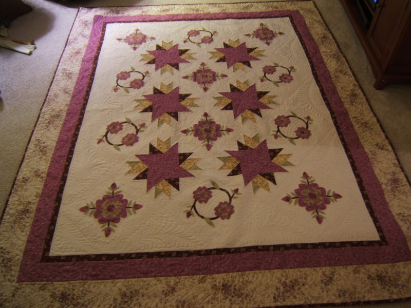 Welcome to my blog. Tag along with me as I learn about quilting on a longarm and frame. I have a Voyager 17 and Hinterberg Stretch frame – setup in my living room in March, 2010. My latest quilt is Pretty in Purple – a design I created, pieced, and quilted. It consists of fused applique and pieced blocks, set on point. I quilted it (my 4th “real” quilt) on my Voyager and frame. When I removed it from the frame, I said “How pretty!”; thus, the name “Pretty in Purple”. I finished piecing the quilt just before I received my machine, and waited until I felt I could do this justice. I think I did ok – my husband says it’s his favorite!