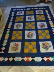 Anyway, here’s the finished product. While I’m not completely happy with the final result, it still looks nice. I did feather vines in the blue, crosshatching in the flower panels, and sunflowers in the 9-patches.
