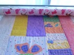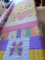 Here’s what is on my frame this week. This is the first of two identical twin quilts. This one is for Isabelle and the other is for Grace. The only difference is the name appliqued on it and the backing fabric. Their mother asked for modern, fun daisies and butterflies. I added a beadboard outer border with a daisy/leaf/swirl inner purple border. I put butterflies, with background lines to make them pop, in the blocks surrounding the center square which has a large giant daisy in it. The pink horizontal block at the top and bottom will have a feather plume or swag and the white print will have small swirls overall.