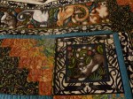 I just took this cute cat quilt off the frame. What a cute quilt! I treated the cats as applique and stitched around them. In the black and white sashing, I quilted swirls. In the log cabin blocks, I did swirly feathers, and stitched in the ditch between the seams. I used So Fine black thread in the bobbin and Isacord black thread on top. I went back and forth over the color of thread to use and wound up with my first choice – black. I used Legacy 80/20 blend batting.