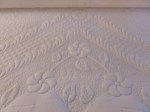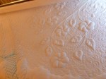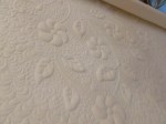 I’m making progress on the wholecloth quilt. Here are a few more pics. I’m excited about this quilt and extremely disappointed at the same time. The top looks great! The back, however, I’ve been fighting tension problems the whole time. I’ve changed bobbin cases 4 times, retimed my machine, and have done every single thing I can think of. I just can’t keep the tension correct at all. I actually ripped out a whole section and redid it, but now, I’m just resigning myself to a back that is going to be disappointing to say the least. The only thing I think is the problem is that I’m using Bottom Line on top and in the bobbin also. My machine seems to work better if the top thread is a thicker thread than the bobbin thread.