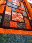 I love this little quilt by my friend Cheryl. Bright batiks and a geometric layout make this a wonderful modern quilt. I decided to quilt the outside border with beadboard, the orange border has a line of funky flowers as do the inner poppy squares. The blocks surrounding the poppy squares were quilted randomly with an array of pumpkin seeds, wavy lines, curvy lines, flower strings, watery lines, swirls and circles. The end result is a pretty, modern look to this bright, graphic quilt.