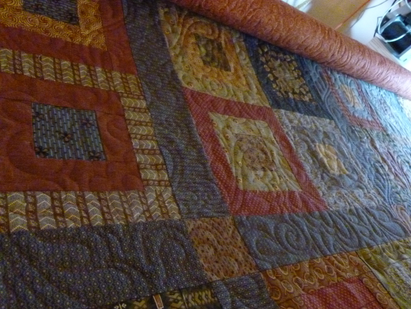 This is the last quilt I’ll do on my Voyager before it gets taken down and delivered to Laverne in Southern Illinois.  This quilt is for a new customer, Mary.  She does fantastic work.  I’m doing a freehand feather vine in the outer border and a panto (feather meander) on the rest.  I like how it’s turning out.  Here’s a sneak peek..