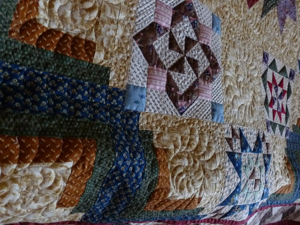 This was a large quilt and I was glad to get it off the frame. I wanted her piecing to be the star, but she also wanted it for a show quilt. So, I used two colors of thin thread (blue and brown Sulky 60 weight) and red So Fine in the top and mostly Bottom Line with some Sulky (blue) in the bobbin. I used Quilters Dream wool for batting. The back was pretty busy and I switched colors in the bobbin from blue to red to cream. The top was also pretty busy, but I went ahead with some custom quilting as that was what the customer wanted. I ended up doing more than I had planned and wound up SID all the blocks. I followed the blue strip in the border with a “pebbles on a curvy vine” – something I made up but kind of works good in this case. You can’t see it unless you have your nose up to it, but it helped define those stripes. In between the blue stripes in the border fabric as well as in the red border, I did a feather vine. The ribbon was straight lines with feathers in the light fabric. The minute I decided to pebble around those feathers in the borders, put me on a course of pebbling around all the feathers in the rest of the quilt as well in the negative space of the blocks. (dang)