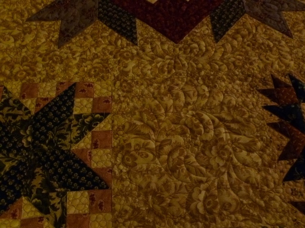 While you can’t see most of the quilting in bright light, it does show enough to draw you in where you find all sorts of surprises. I tried getting a good pic, but the lighting wasn’t very good when I had time to take pics. This was a monster 97″ square and I’m glad to get it off the frame and move on to the next one (bright blues, oranges, black quilt coming up!). I’ve had my time distracted by an unplanned kitchen remodel due to a leaking dishwasher and a couple of funerals, but I’m back in the swing of things for now.