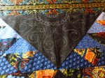 The outer border kind of gave me pause. I wound up following the stripe in the border and did a double opposing wavy line. In between those stripes I did a swirl vine that was a larger version of the same swirl vine I used in the black sashing. The outer border was done in green thread (thanks Margaret for the tip on that) and I also used green in the “star” blocks. I used gray Sulky in the orange half-square triangles adjacent to the white and black print. In those blocks I outlined the motif in the black/white print and did the same swirl pattern emanating from the motif into the orange 1/2 sq triangles. In the blue blocks surrounding the inner edge of the black triangles, I did pumpkin seeds – treating the 1/2 square triangles and the large print fabric next to it as one block. The star blocks were quilted with the same swirl design in the middle and 1/2″ straight lines in the background blocks in an effort to emphasize the stars as much as I could.