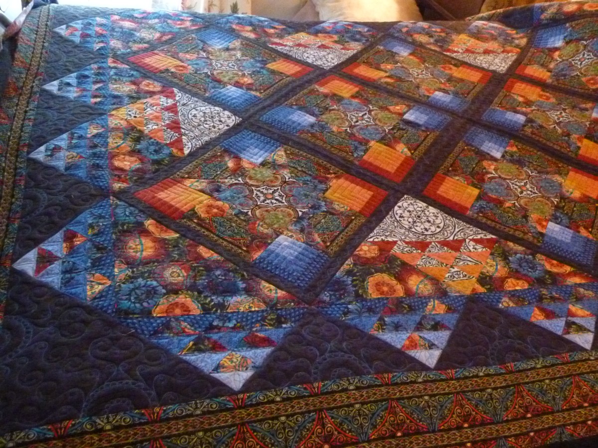 • i used a white mechanical pencil. i have a stencil with nested circles 1/2″ apart and used the 1st and 3rd circles to draw the half circles. i then freehanded 1/4″ circlez below each of those and filled with circles. I then uaed a straight ruler to draw a line from the base of the center circle to the edge of each pieced section of the adjoining blocks. Within those straight lines I drew the swirly circles. I drew each one out for several of them, but I soon had the spacing and movement down so i only needed the straight lines to mark the boundaries.