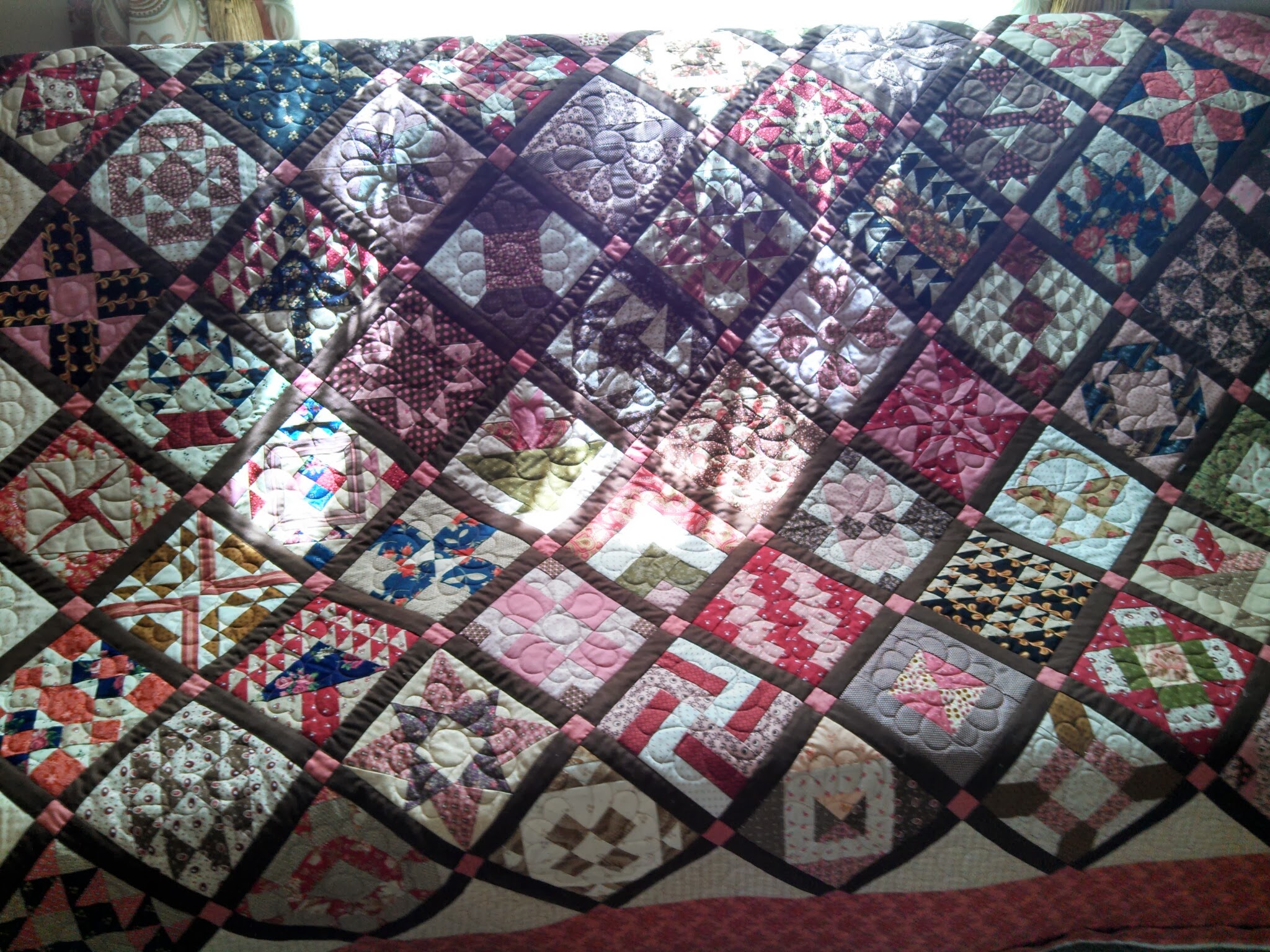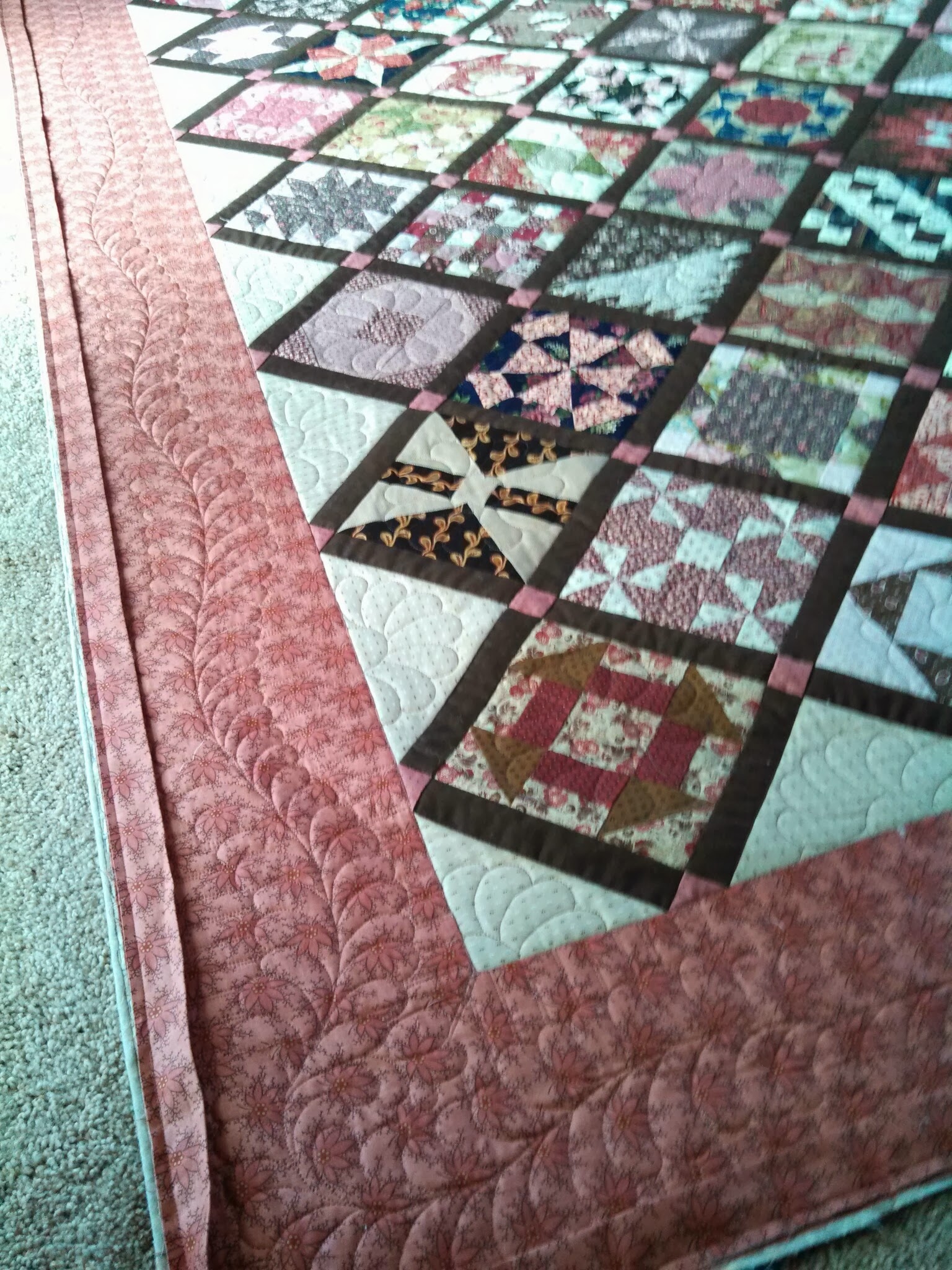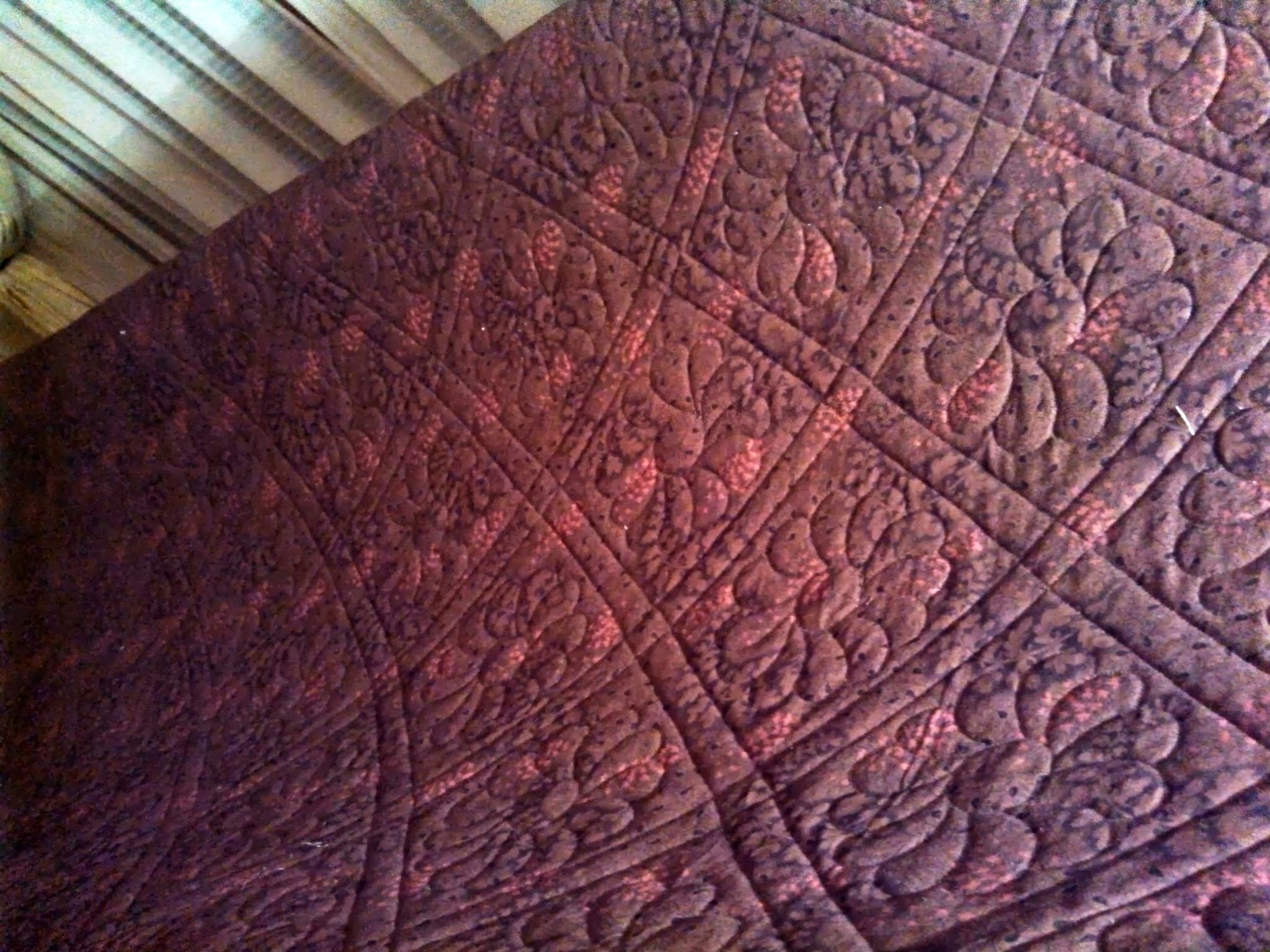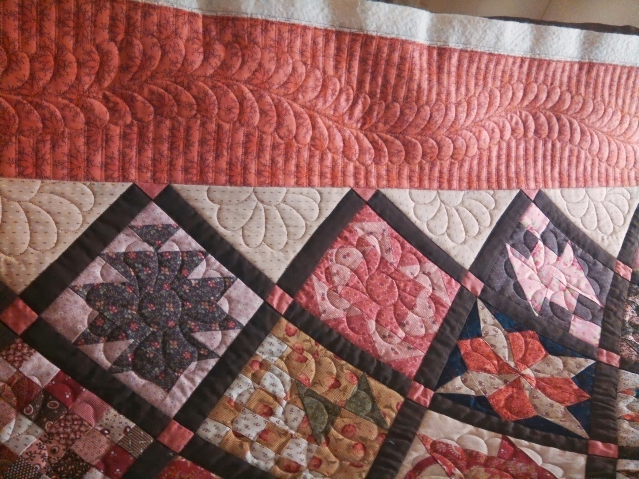 She did a fabulous job with this quilt. I loved everything about her quilt. It looks so nice in my house, I wanted to just keep this for a while. We decided on a modified feather wreath in each of the blocks and a feather vine with beadboard in the outer border and SID around all of the sashing. It went fairly fast. I used the same blush colored So Fine thread over all the top and a darker brown on the bottom. I also added the binding while it was on the frame, which makes it so nice to finish it by hand.