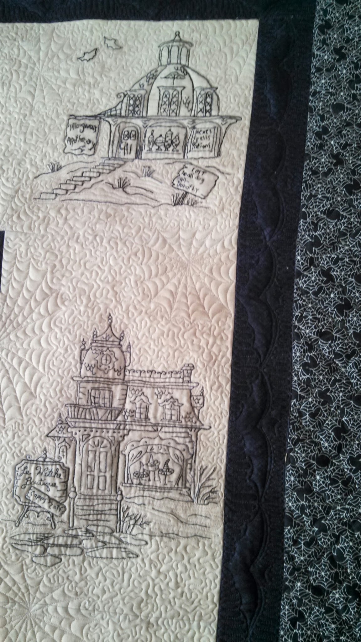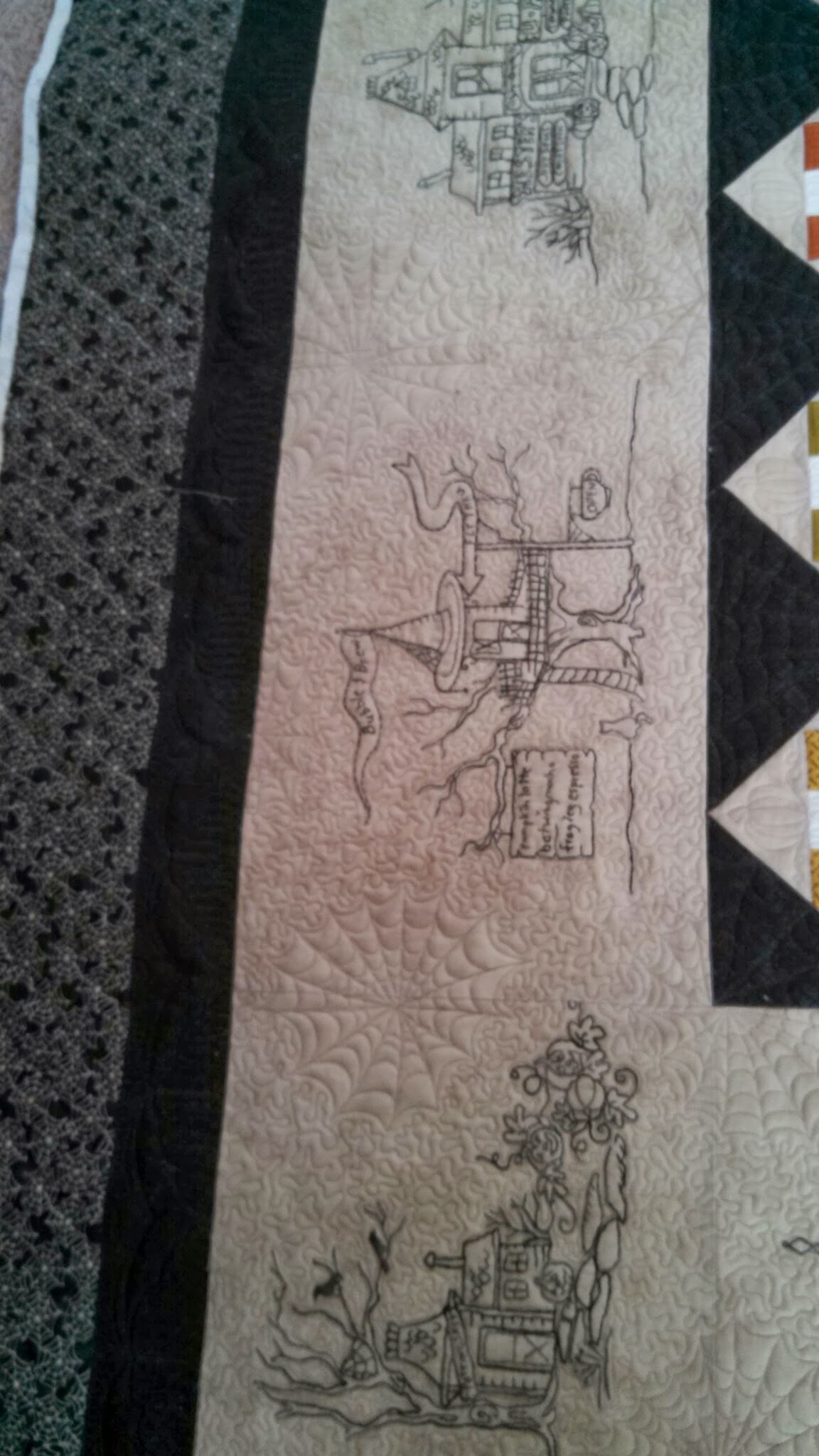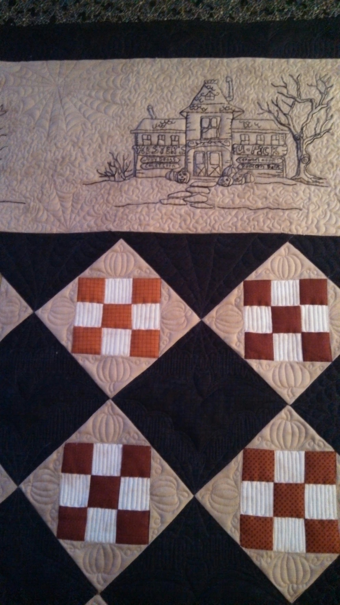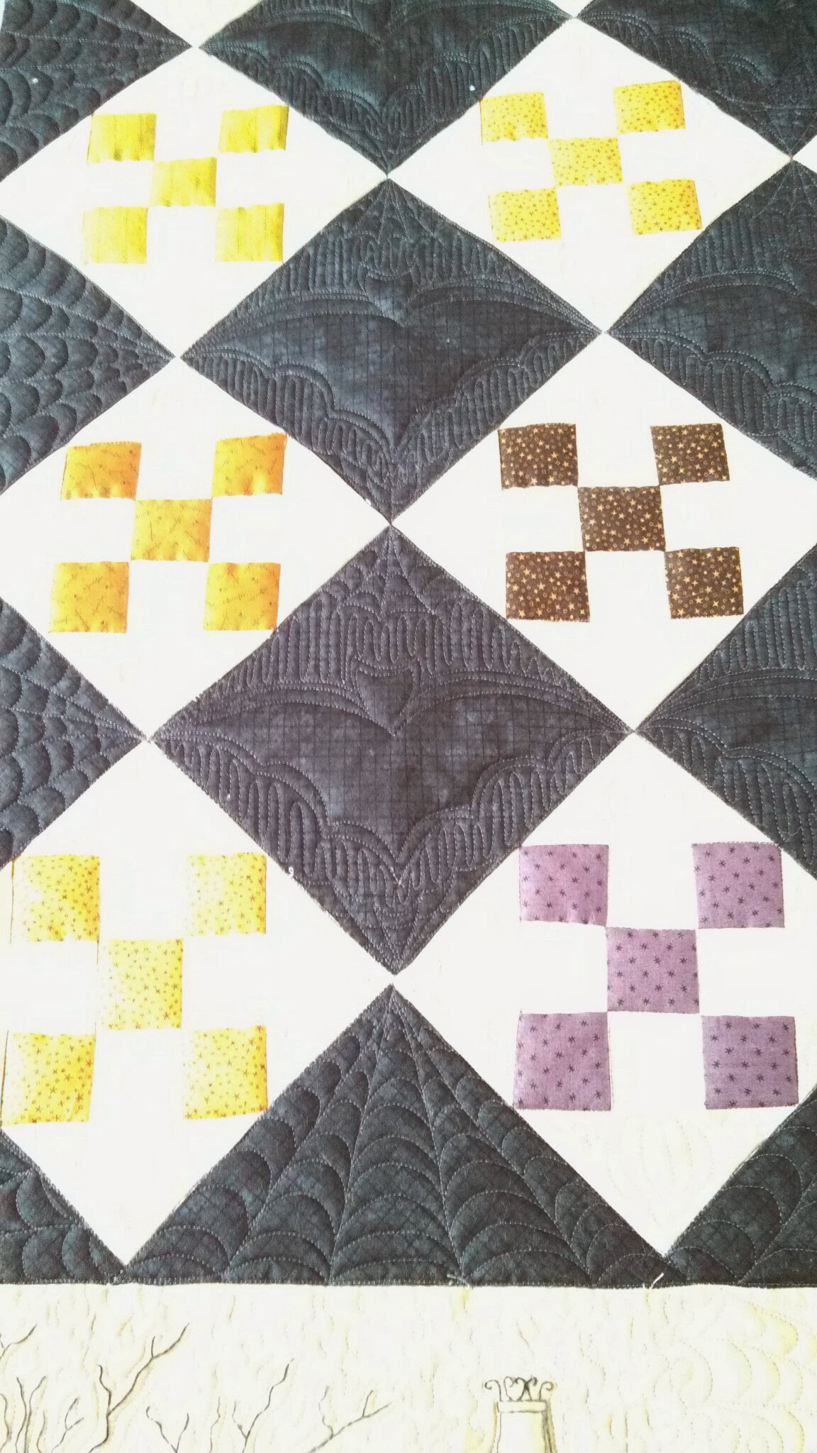For this Halloween quilt, I came up with a bat motif that I could stitch in one pass in the borders and the black blocks and did a shaky crosshatch in the outer border and stippling around the embroidery. The middle 9 patches got a pumpkin design also. I loved how this turned out and so did he. Two battings – 80/20 on bottom and cotton on top. So Fine and Bottom Line threads.