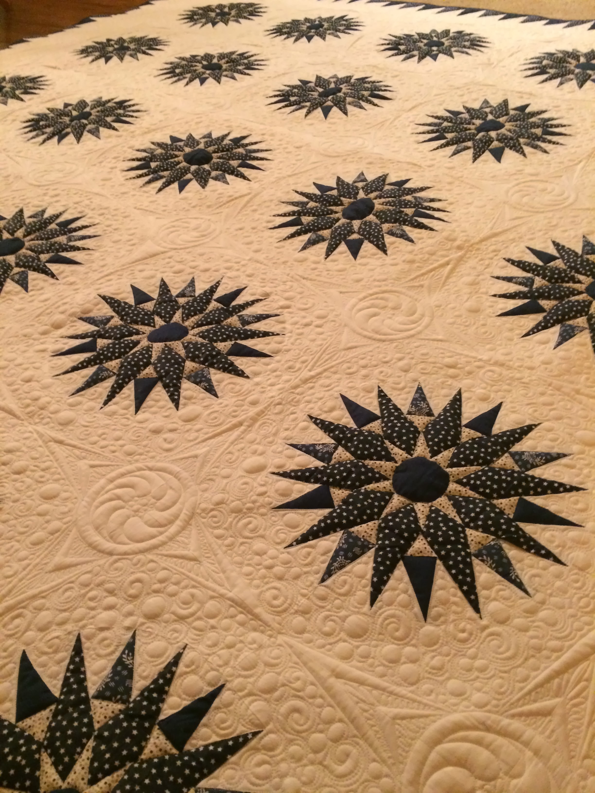 I auditioned a few designs while it was on the frame to decide which one I thought would go well. I’ll came up with this compass-like design and it goes well with the look of the quilt…kind of a cosmic northern star look. I borrowed the background fill from Judi Madsen – I had been waiting on just the right quilt to use that technique and I think it works perfectly here.