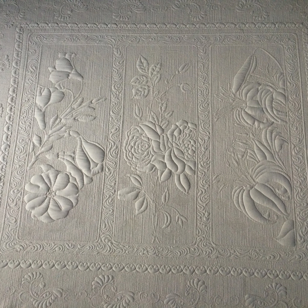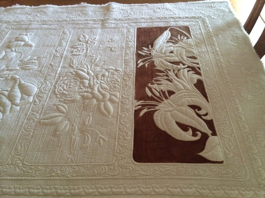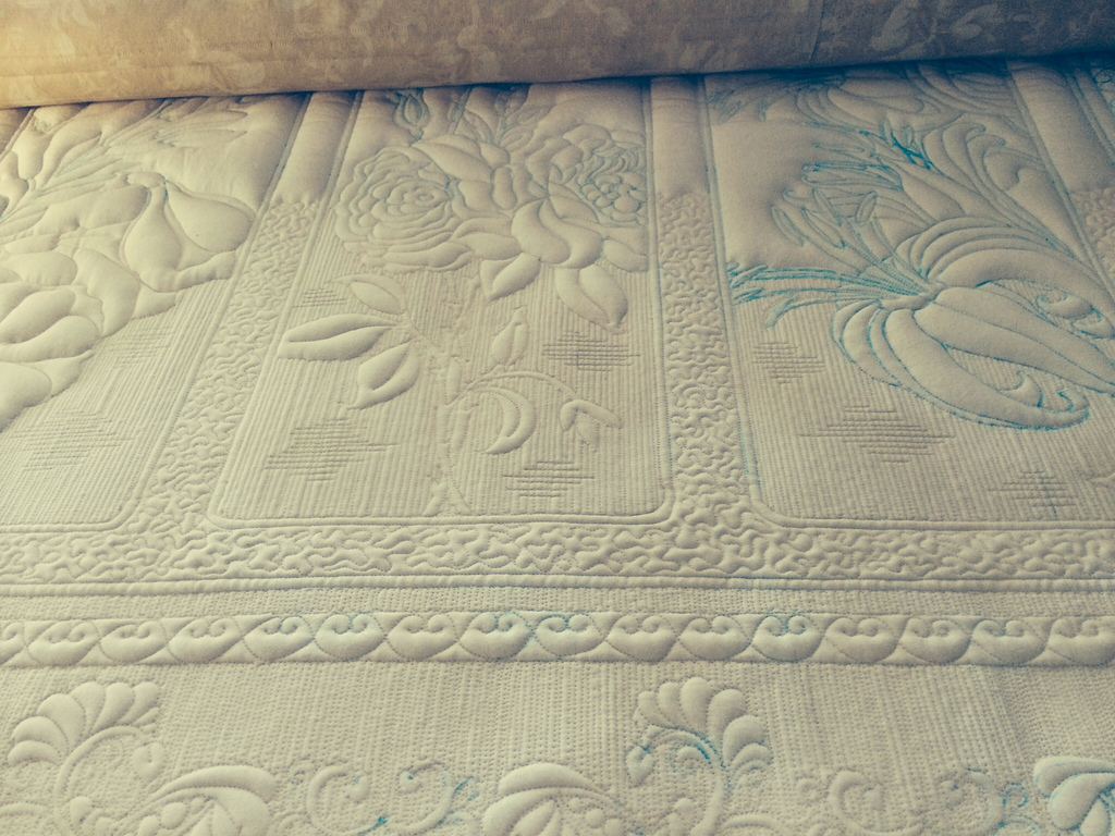 Once I was done tracing, I loaded it on my longarm and quilted the design.  I used two layers of batting. One layer of Quilters Dream puff over a layer of 80/20.  It really gave it a faux trapunto look.  I love how it turned out.  I had started quilting the “sashing” with a medium sized meander, but ripped it out after discovering it was full of bad tension. I requilted it with a McTavishing type of fill and am SO glad I redid that part of the quilting.