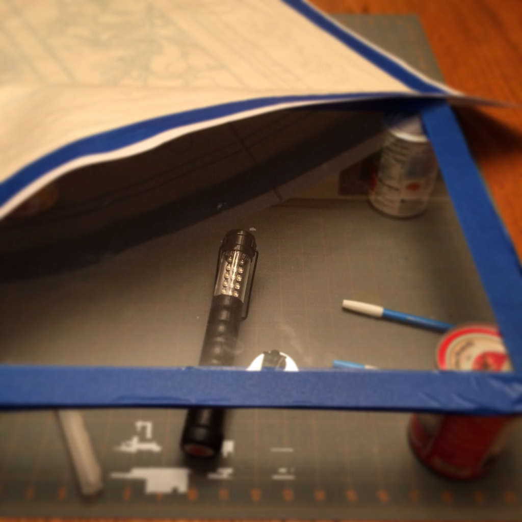 I designed this in Adobe Illustrator and then printed it out onto large sheets of paper which I then taped together into one large piece.  It measures about 44 x 39.  I then created a light box.  Rather than spend the money for a fancy light box, I created it out of a piece of window glass (available at your local hardware store) and some vegetable cans and an LED light. It worked pretty slick for me.  I then traced the design onto my PFD (prepared for dying) muslin. I used a blue water erasable pen. If you trace outside the lines, you can go back with a water filled pen or a q-tip dipped in water to erase the stray lines.