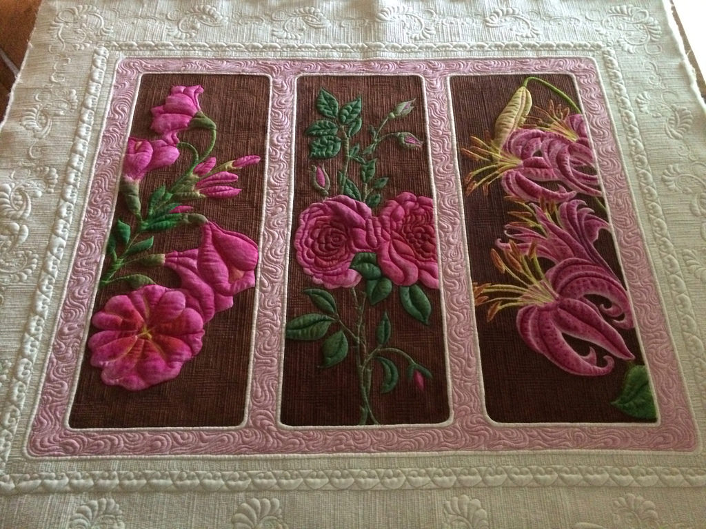 Above, is the finished painted wholecloth quilt. Even the binding and piping were painted. I loved this whole process. I learned so much about paints and inks and what to do and what not to do.