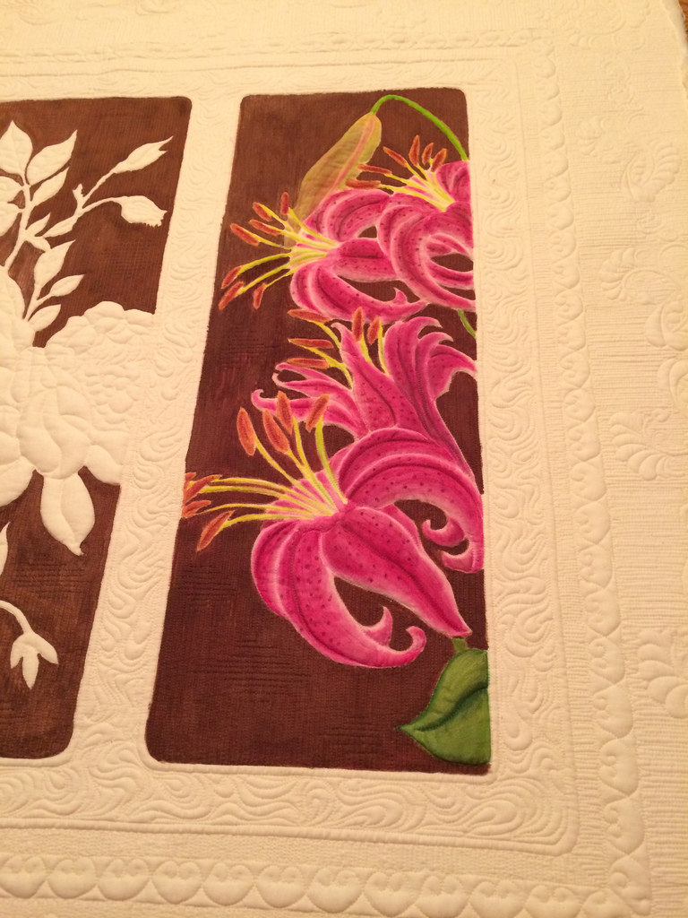 Above, is the finished painted wholecloth quilt. Even the binding and piping were painted. I loved this whole process. I learned so much about paints and inks and what to do and what not to do.