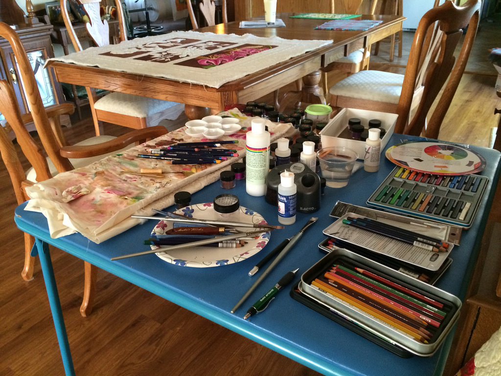 While I have done some small projects with Prismacolor and Inktense pencils, this is the first project using the polished pigments and the first really “big” painted project.  I like using the polished pigments, but you have to be careful when mixing them with the medium.  I thought I could lighten the colors by just using more medium, but it doesn’t work well for large areas at all.
