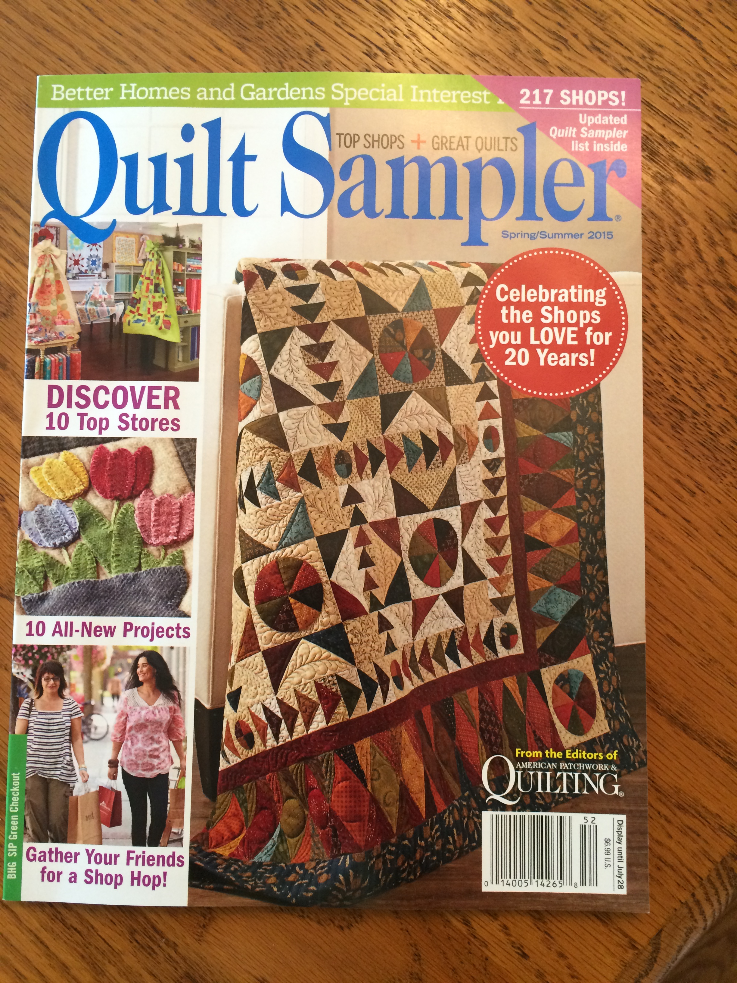 In the latest edition of Quilt Sampler magazine (available here soon), a quilt designed and made by my local quilt store owner – Kate Laskowski of Main Street Quilt Company – and quilted by ME, is not only featured in the magazine, but is also on the COVER! Yes, the cover of the magazine! Isn’t that just awesome! I feel so honored to have been a small part of this great accomplishment by Kate. I’ve known for a while now that the quilt was to be one of 10 featured in the magazine, but only recently found out it was chosen for the magazine cover.