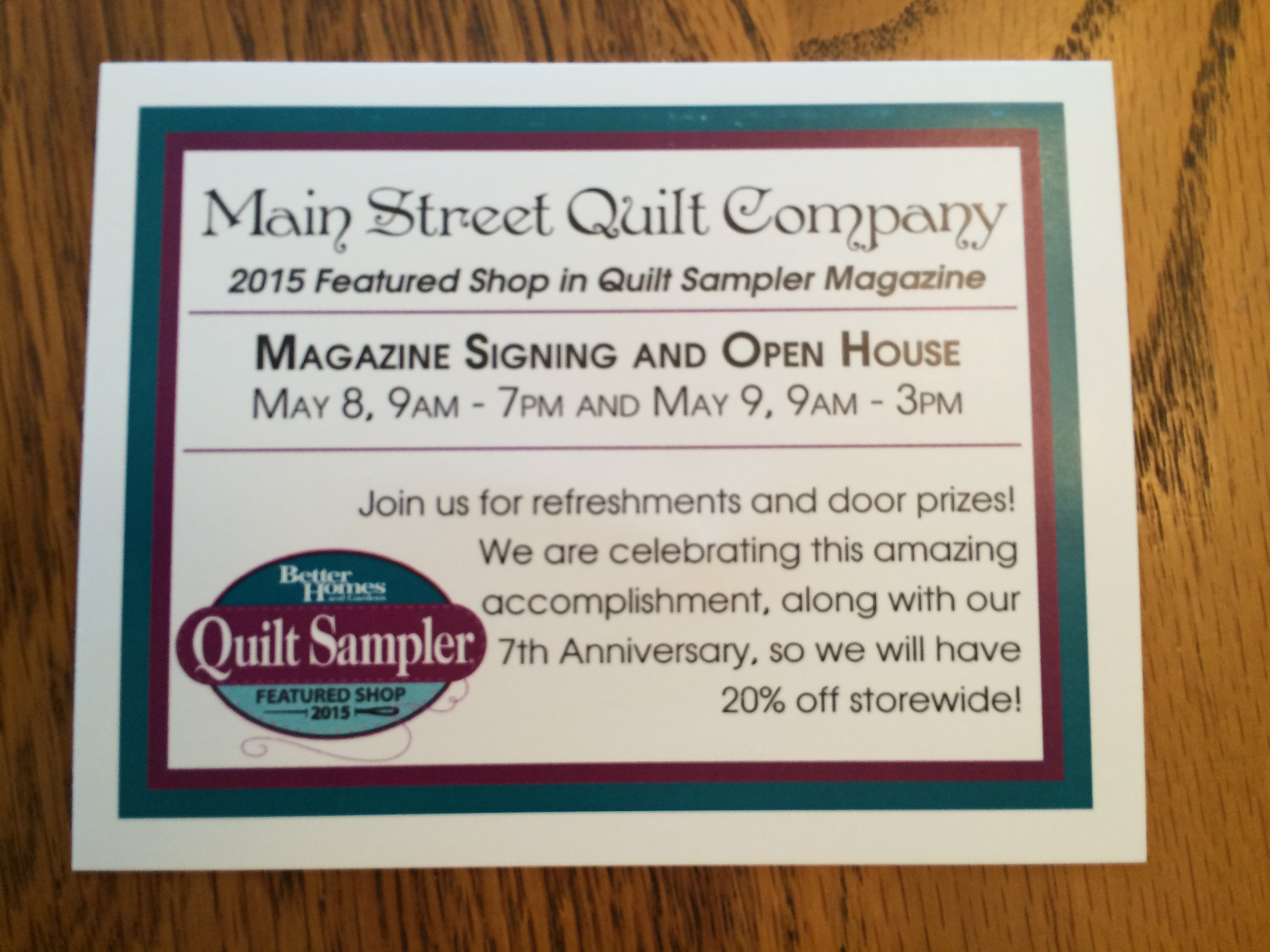 Quilt Sampler is a magazine that features 10 shops from around the nation. Quilt shops submit a detailed application on their history, business promotions, charitable work, teaching schedules and design philosophies. A panel of quilt experts, led by Linda Augsburg, editorial content chief of American Patchwork & Quilting magazine, narrows down the applications to 10 featured shops for each issue. To be chosen as one of the featured shops is quite an honor. You can read more about Kate’s story here.