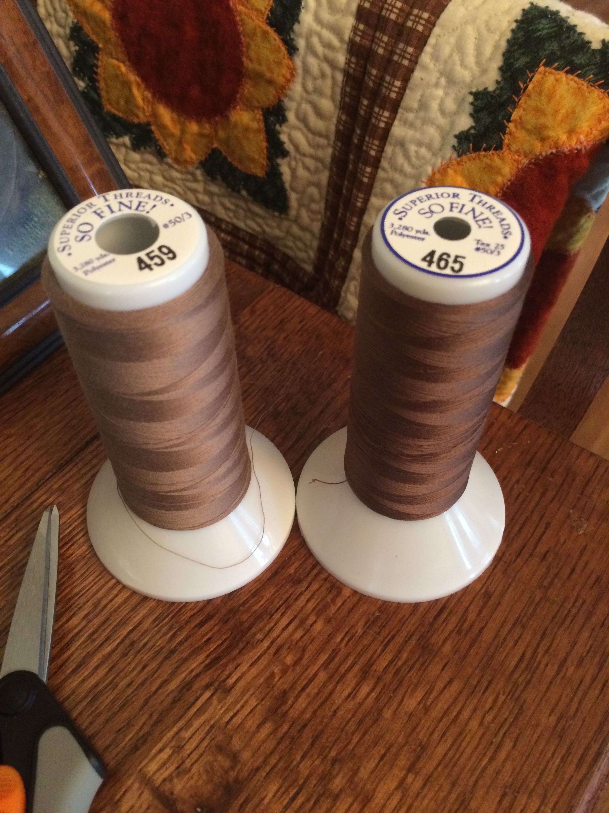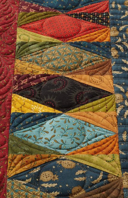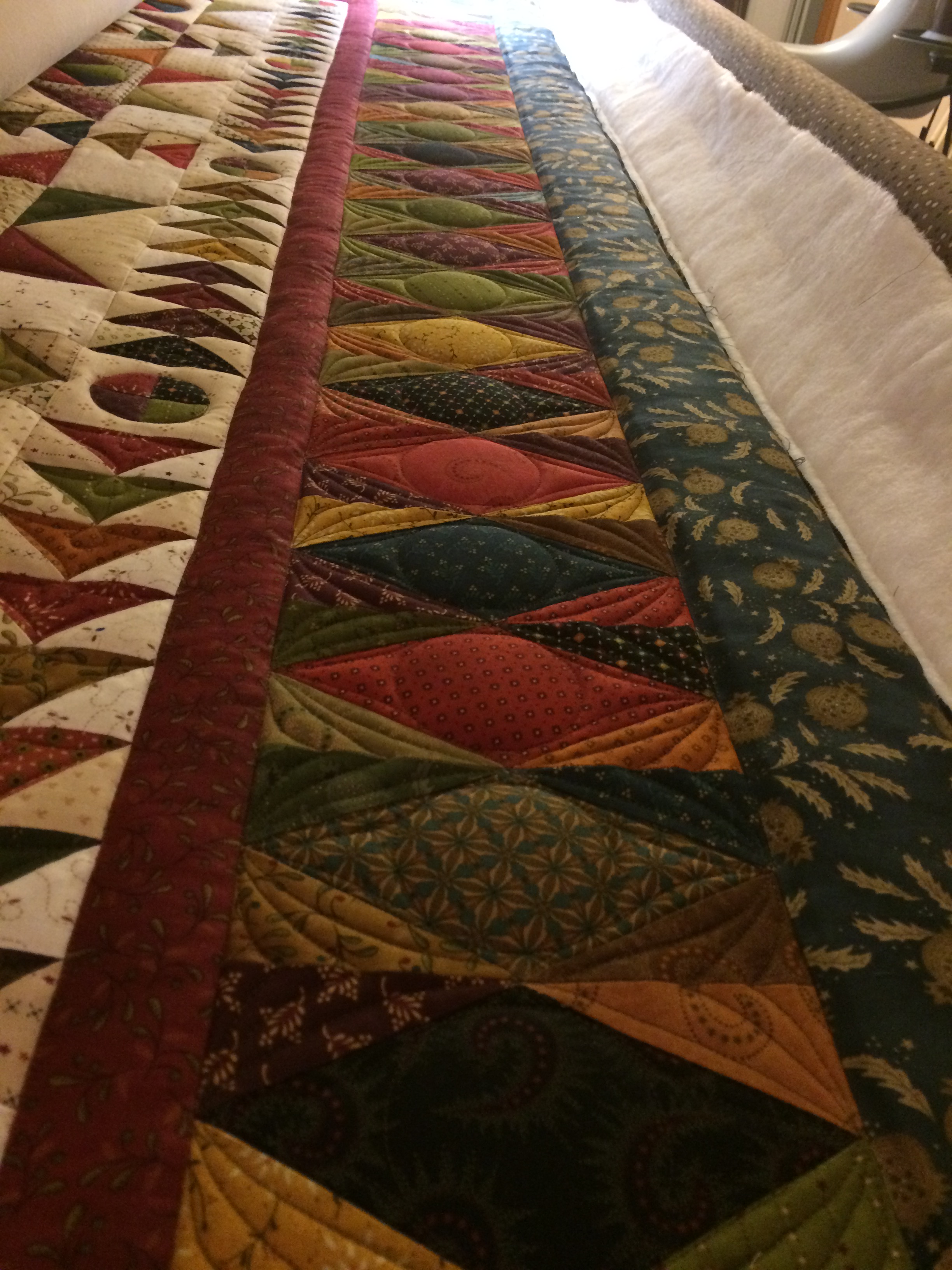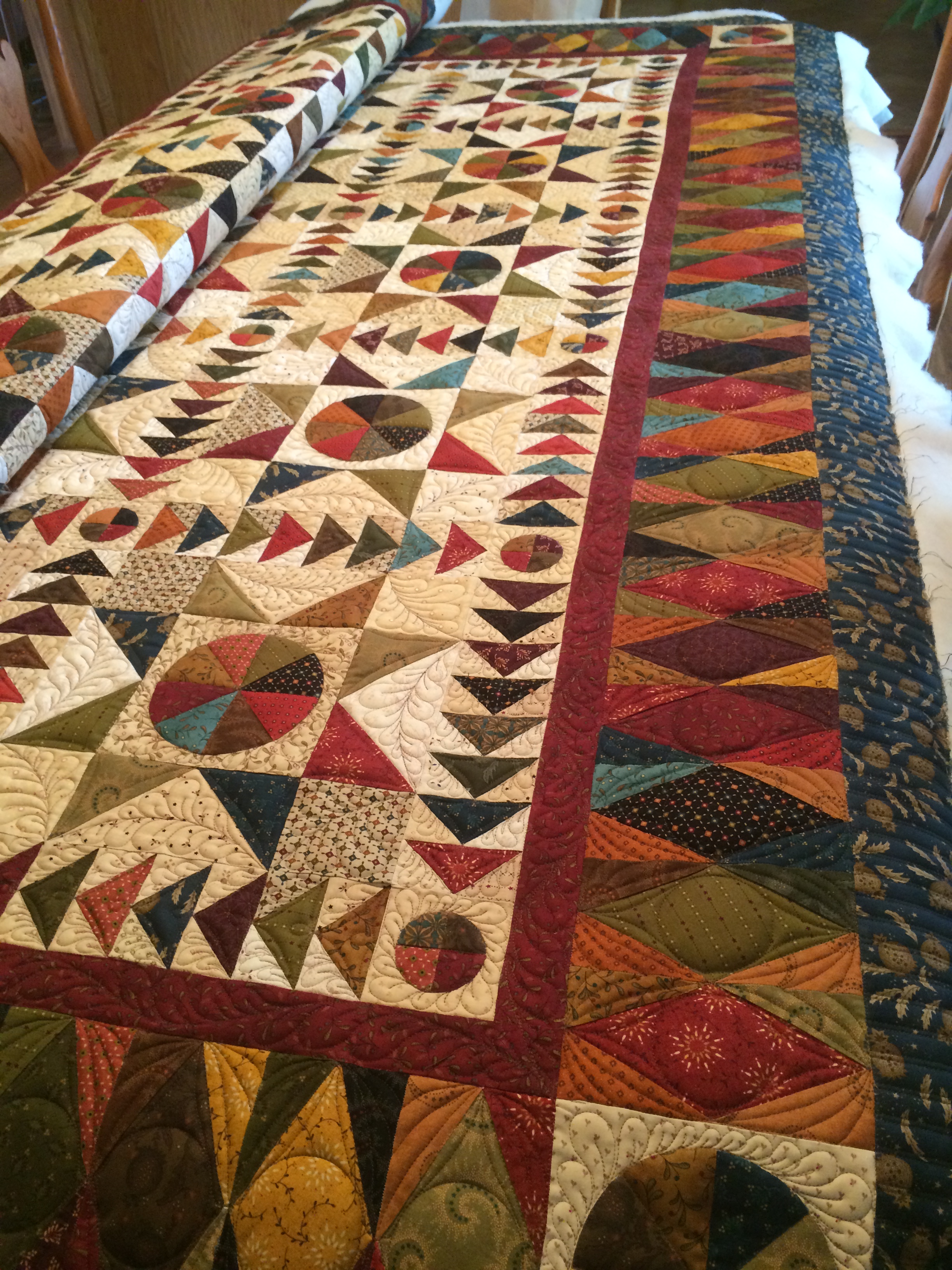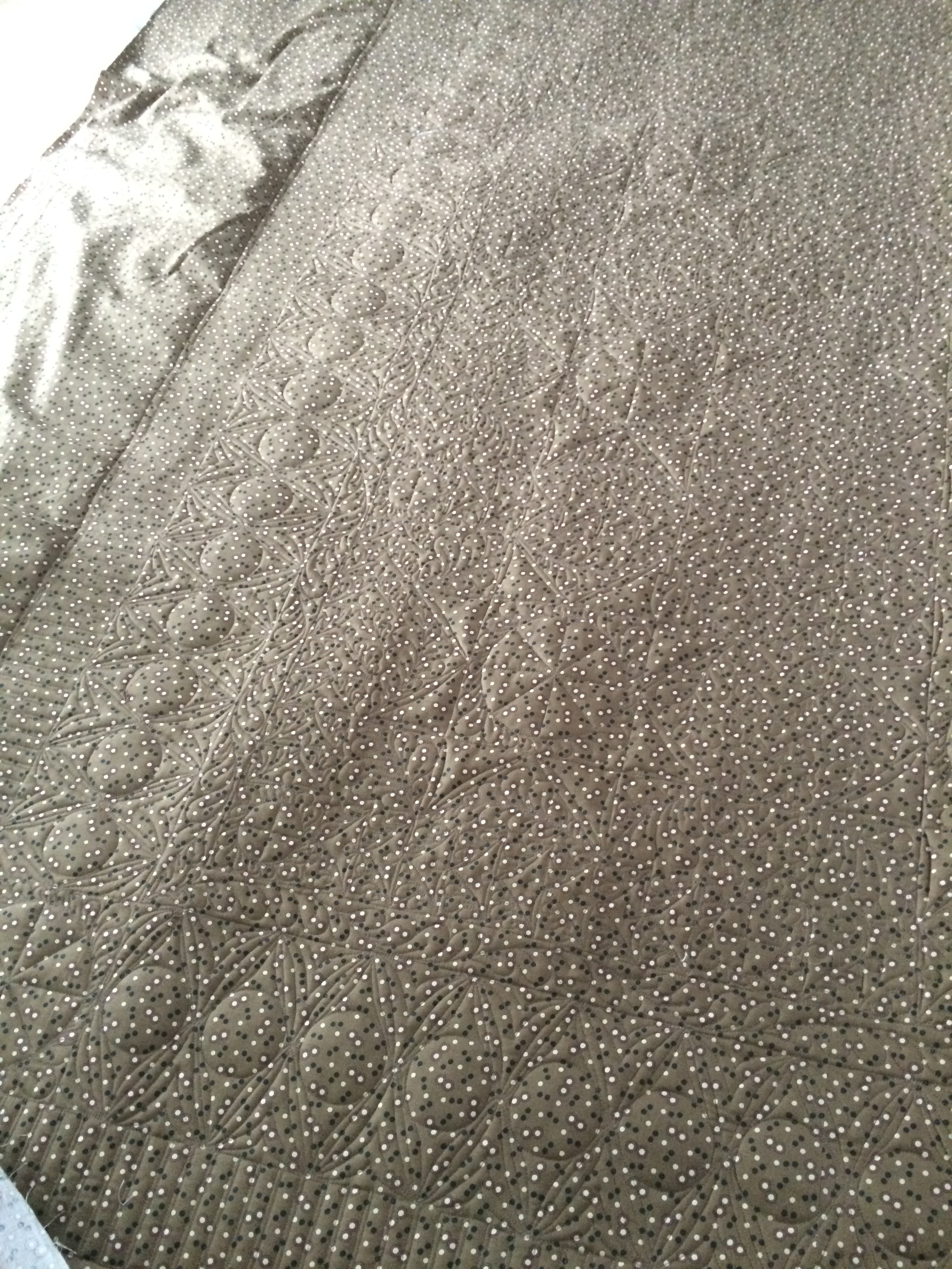 Using the printed circle template, I did the circles in the diamond border. I then went back and freehanded the arcs on either side of that design. The rest of the quilt got feathers in one form or another, continuous curves and stitching in the ditch. I used two cones of Superior So Fine in different shades of brown on top and a brown Bottom Line in the bobbin. I timed myself as I went and I knew I had to spend a minimum of two solid hours each evening. I took a vacation day from work on Friday and managed to finish it at noon on Sunday. Kate picked it up and spent the rest of the day binding it and preparing it for shipping the next day. Whew! What a whirlwind she had been on!