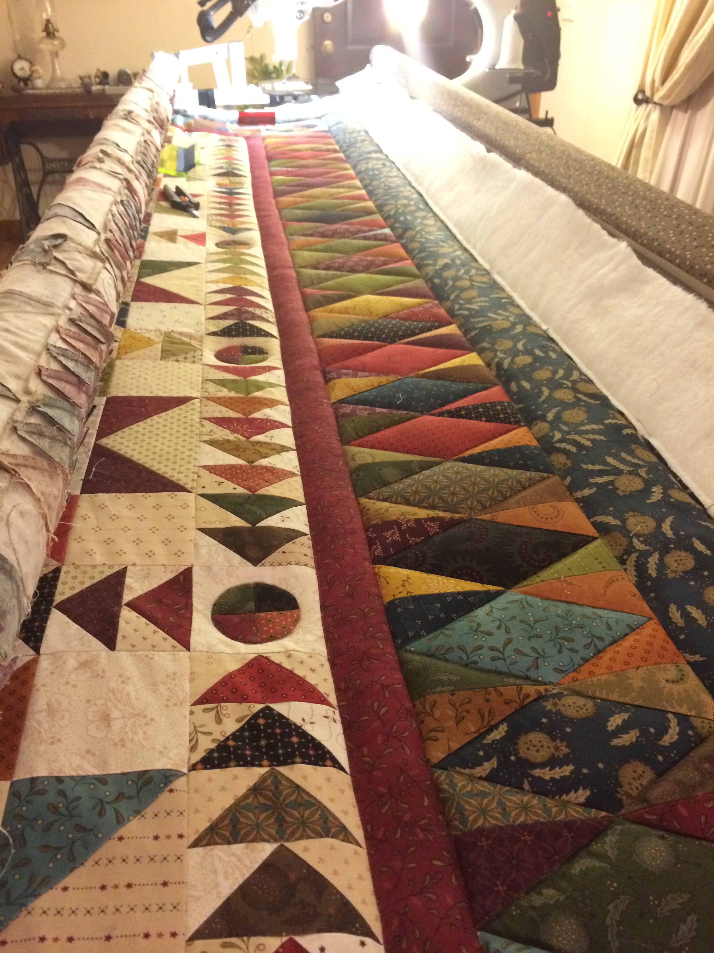 Last October 14 – it was a Tuesday during my lunch hour at my day job – I got a message from Kate asking if I could possibly quilt a quilt for her. And have it done by the weekend. Intrigued, as Kate is a great longarm quilter too, I asked “how big is it?” When she replied it was a queen size, I chuckled and asked her to call me as I knew there had to be more to the story. She told me what I was about to hear was confidential, and explained that she had been chosen to be a featured quilt shop in the next issue of Quilt Sampler magazine. As part of that process, each quilt shop is to create their own original pattern which would be available as a kit once the magazine was published. When I asked why she didn’t quilt it herself, she replied she was just a little stressed as the fabrics for the quilt had been delayed and she had spent many late hours to get the quilt put together. If I remember correctly, she made this quilt in just a few days. OMG! Seriously!! The quilt had to be bound and in the mail to the editors on Monday. And, to top it off, her family had booked a mini vacation to Chicago for her birthday the coming weekend. Of course, I said I would quilt it. I met her at her shop after hours that evening and brought it home.