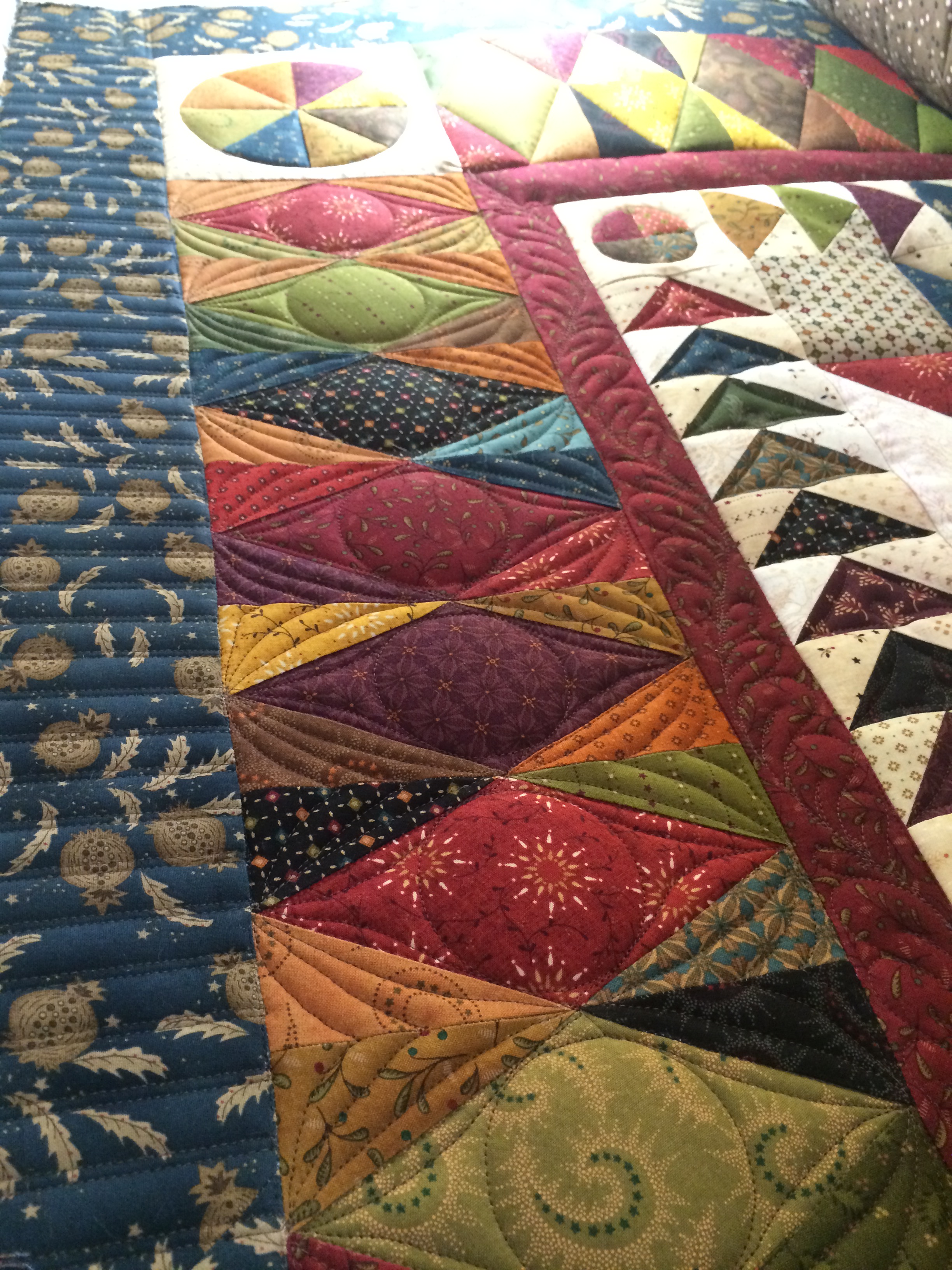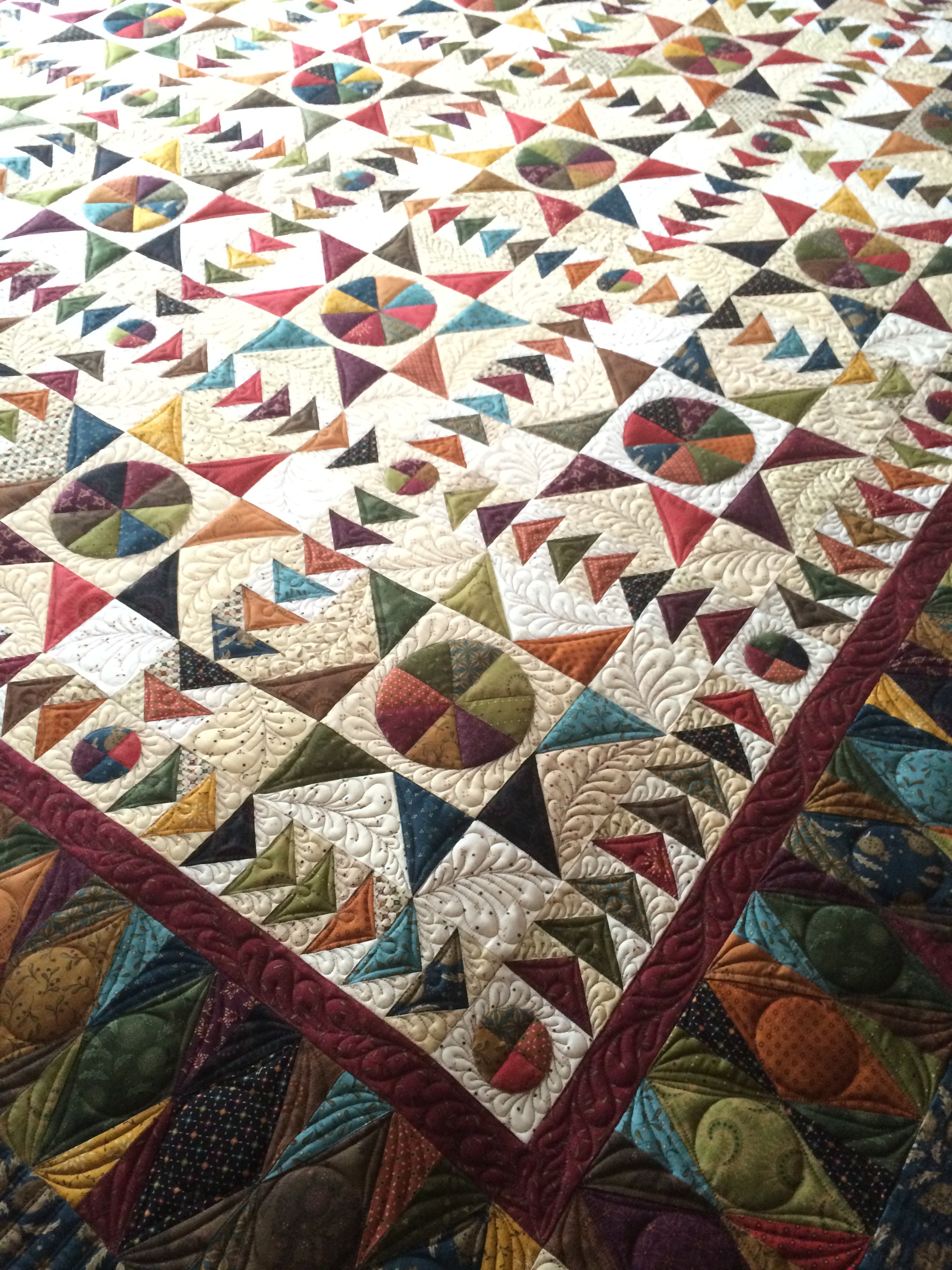 The outer border was a busy print, so I knew I was going to do something quick that gave good texture – Beadboard quilting. In the diamond border, I knew I wanted to mimic the circles from the rest of the quilt. I auditioned a few circle templates I had, but none of them were the correct size and I didn’t have anything else in the house that would work. I knew I couldn’t get one ordered and delivered in time. My day job is in marketing, graphic design and technical applications at a CAD reseller, targeting manufacturers, architects and civil engineers. One of the products we sell is a 3D printer. So, I printed out several circles in varying sizes and was able to use one of them for this design. How cool is that!