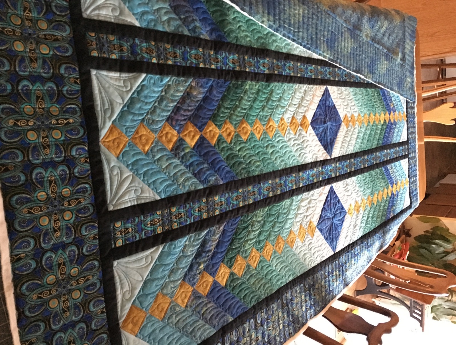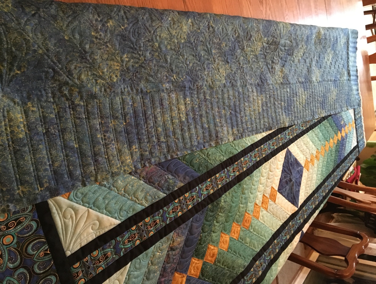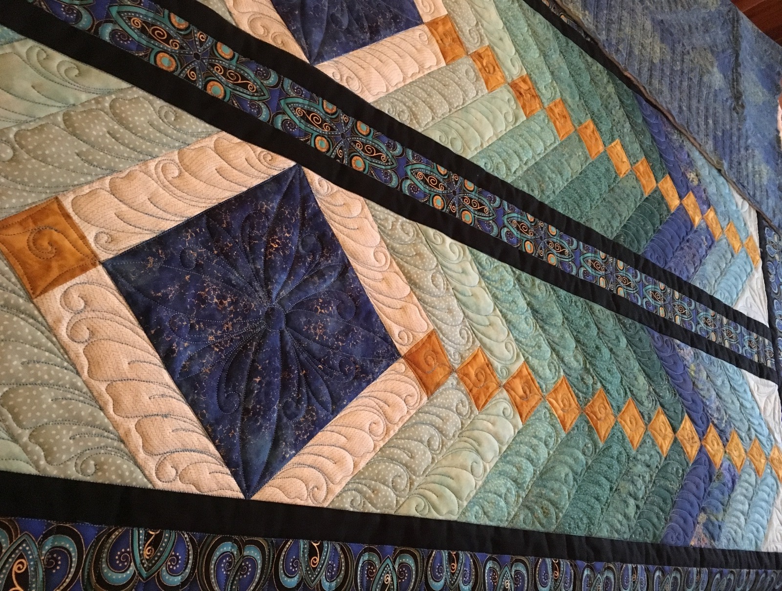 I am finding it hard to schedule quilting time right now. A lot of you know that my parents’ home burned down on Jan. 21. They had lived there since 1968 and it has been pretty traumatic for everyone. We are making progress in the rebuilding process and other associated tasks; but I’m really feeling the interruptions. The Bali Wedding Star that I finished a couple of weeks ago was probably the first one that I felt I was out of tune with the quilt. Finding time to quilt is an issue right now; but creating the quilting design has proven to be more difficult. My mind needs to be in “speak” with the quilt and I’m extremely distracted right now. I’m thankful to have some wonderful clients who can allow me time to recover from the stress. That said, I have TWO quilts that need to get done in the next month and THREE more that need to be done in the following month; and I have to travel for work in a few weeks also. PLUS, I was contacted yesterday by the owner of a quilting book company who wants me to quilt her quilt designs. OMG.