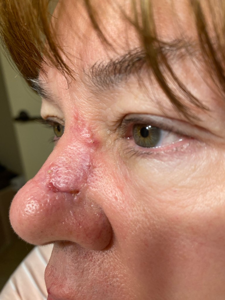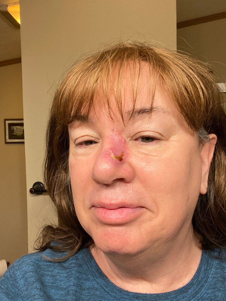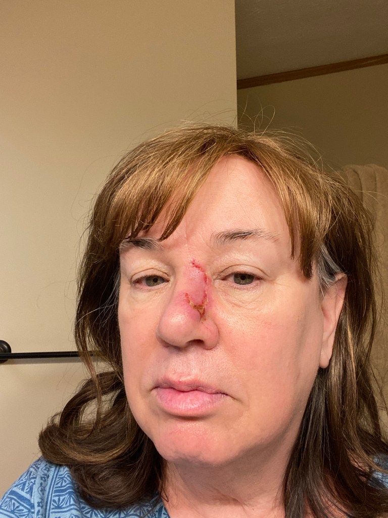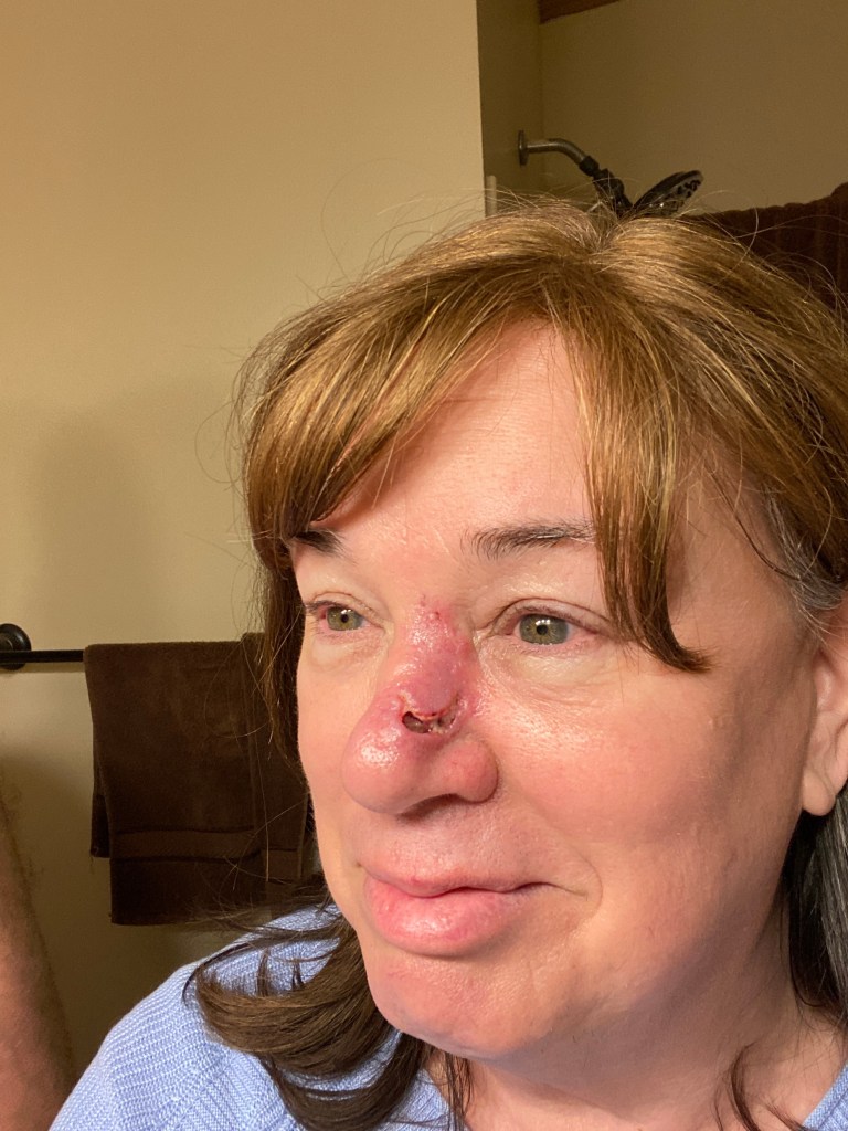 6. My doctor is treating my two BCCs with a cream which kills the cancer cells. One on my nose and one just below my nostril. It’s taking several weeks and looks pretty horrible but there’s no subsequent scarring. Magic.